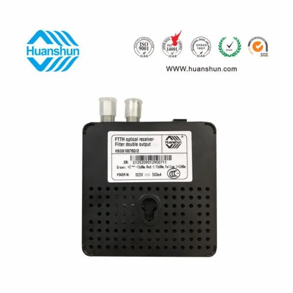 濾波型雙輸出FTTH光接收機(jī) | HSGS10076D/2 | 1540~1565nm接收,-5~-15dBm/RF 2×72dBuv恒定輸出,外接90~255V 5V 0.5A電源適配器 |
